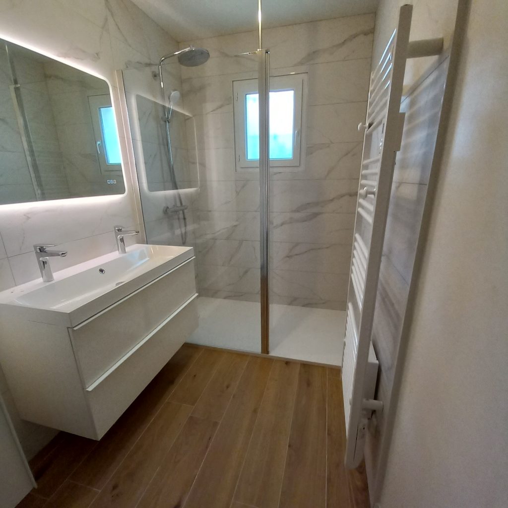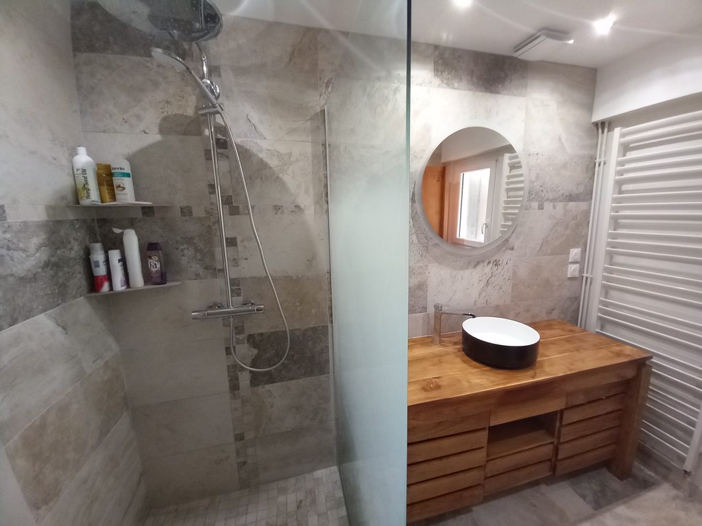 Création de salle de bain complète ouverte sur chambre, travaux entièrement réalisés par BR après démolition cloisons